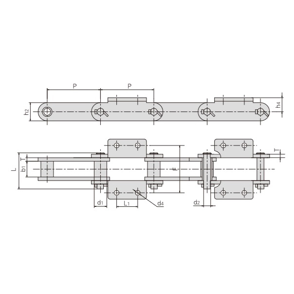 - Las placas de conexión en forma de L, con una sección vertical fijada al extremo superior de la placa de cadena interior con orificios de montaje horizontales, mejoran la dispersión de la carga y evitan la deformación o los daños causados por fuerzas desiguales.