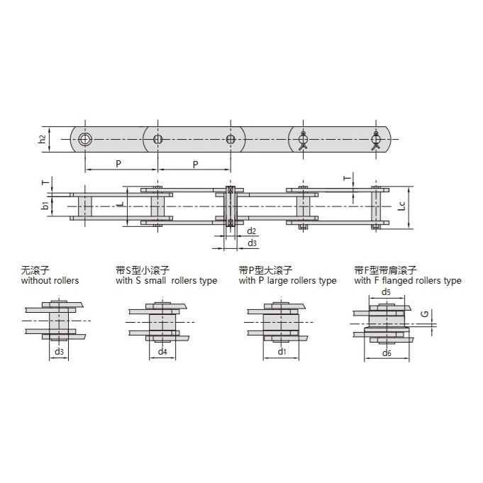 - Rodillo grande tipo P:El diámetro del rodillo supera la altura de la placa de acoplamiento, adecuado para líneas de transporte horizontales o inclinadas medianas y pequeñas.