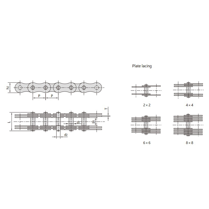 - Combinación de dos placas de cadena gruesas y tres placas de cadena finas, lo que proporciona una fuerza uniforme y simétrica sin momentos flectores adicionales.